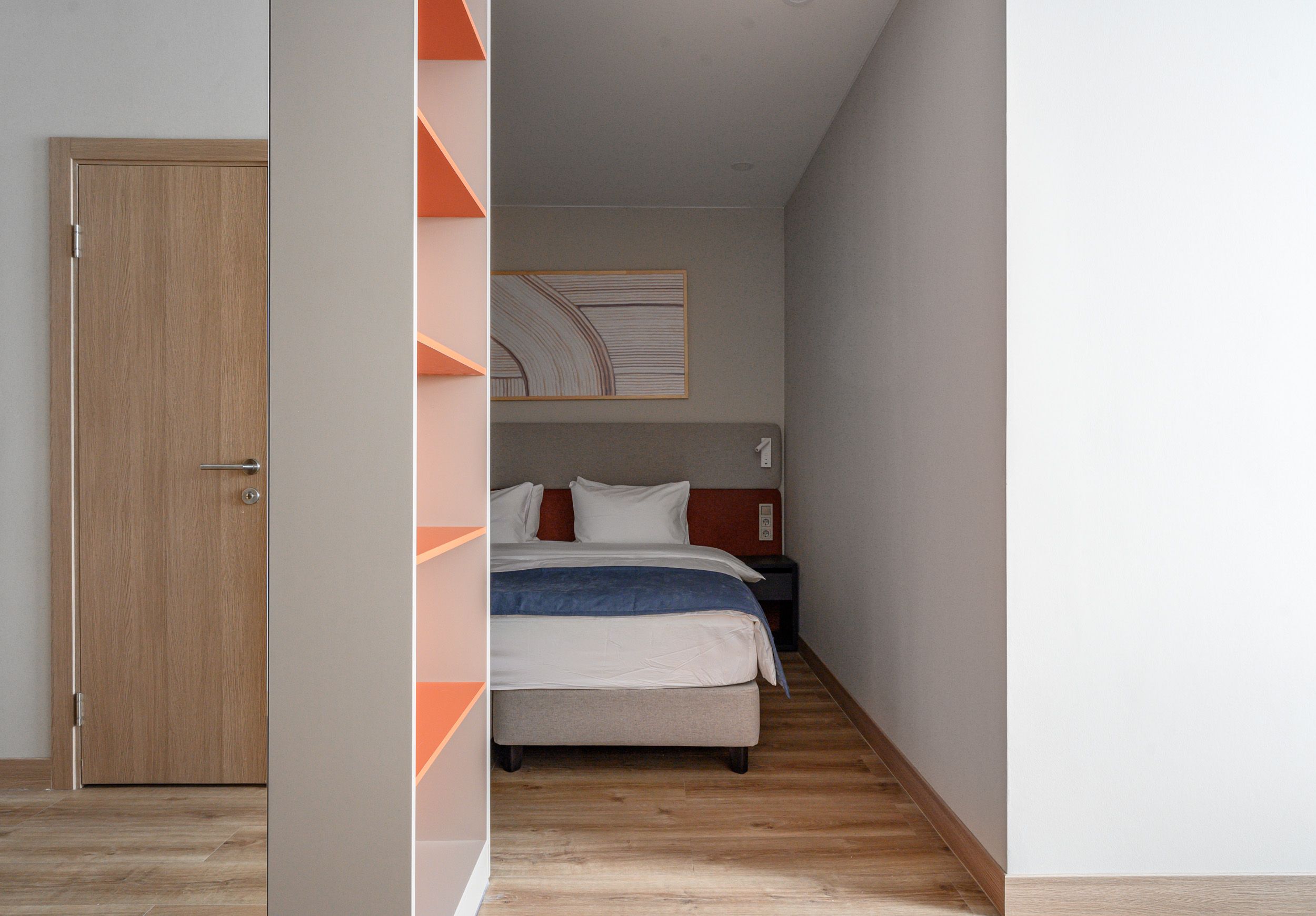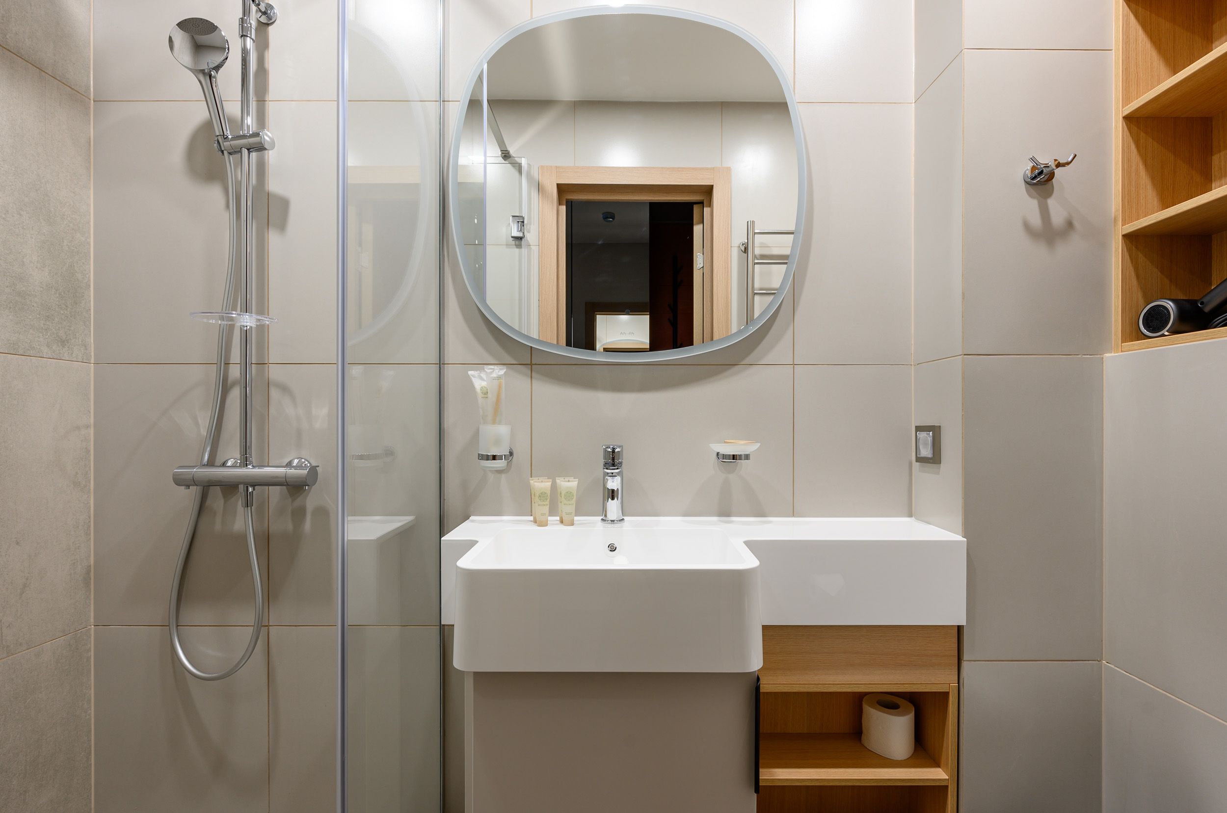 В Corner всё устроено иначе, чем в обычных номерах. Здесь нет глухих стен, но есть умное зонирование. Спальня плавно перетекает в гостиную, кухня — в обеденную зону, а рабочий стол стоит ровно там, где удобно вам. Пространство дышит и движется вместе с вами.