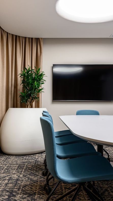 Просторные переговорные комнаты подходят для встреч с партнёрами, командной работы и деловых обсуждений.